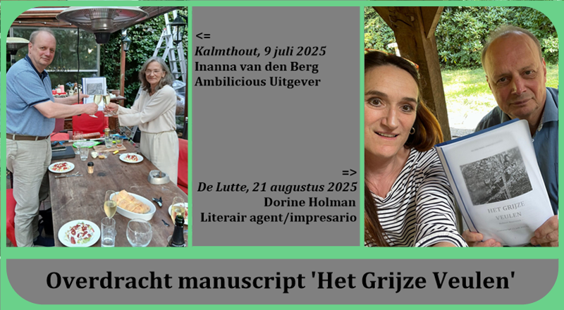 Op 9 juli 2025 draag ik het manuscript met de titel Het Grijze Veulen over aan Inanna van den Berg, initiatiefneemster van Ambilicious Uitgever.